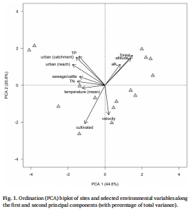 PCA分析:軸1(44.6%方差)代表污染梯度,城市化/農(nóng)業(yè)用地與DO赤字、高分解率顯著正相關(guān)(圖1)。
