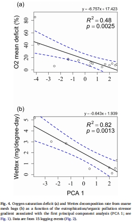分解速率:污染河段Wettex分解速率達(dá)5.45 mg/度日(vs. 原始河段0.12 mg/度日),與營養(yǎng)鹽負(fù)荷正相關(guān)(R2=0.82, p=0.001;圖4b)。