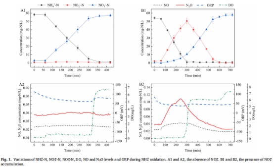 混合路徑主導(dǎo)低DO環(huán)境:低DO下NO??與NH?OH共存時,生物(硝化菌反硝化)與非生物(化學(xué)反應(yīng))混合路徑是NO/N?O的主要來源(圖4B2)。