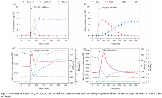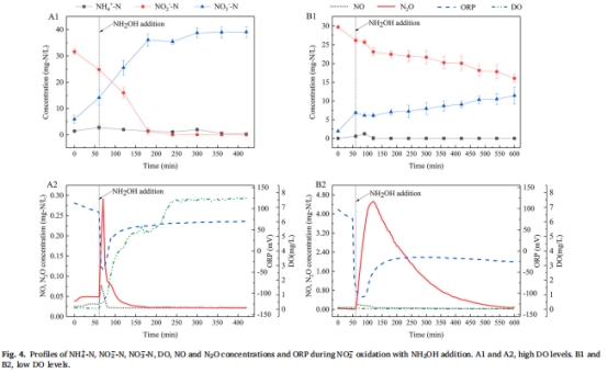 NH?OH氧化與DO正相關(guān):NH?OH氧化產(chǎn)生的NO和N?O總量與溶解氧(DO)水平呈正相關(guān)(圖2A2/B2),高DO下總產(chǎn)量更高(NO: 0.159 mg-N/L, N?O: 0.363 mg-N/L)。