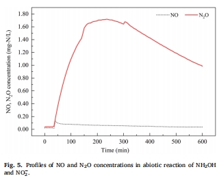 非生物反應(yīng)貢獻顯著:NH?OH與NO??的化學(xué)反應(yīng)可直接生成N?O(峰值1.719 mg-N/L),占氣體總產(chǎn)量的30%以上(圖5)。