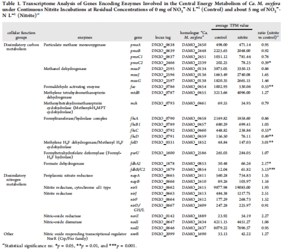 多組學(xué)分析:宏基因組/轉(zhuǎn)錄組解析Ca. M. oxyfera的氮代謝基因表達(dá)(圖3,表1)。
