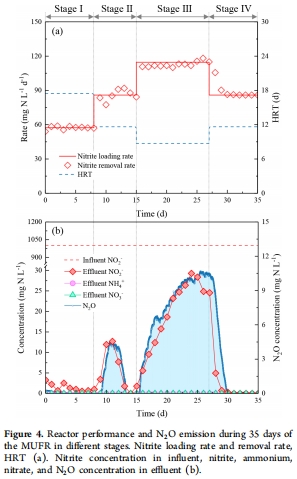 35天MUFR運(yùn)行模擬廢水處理,動(dòng)態(tài)調(diào)控亞硝酸鹽負(fù)荷(57.3→114.6 mg N/L·d),監(jiān)測(cè)N?O排放(圖4)。