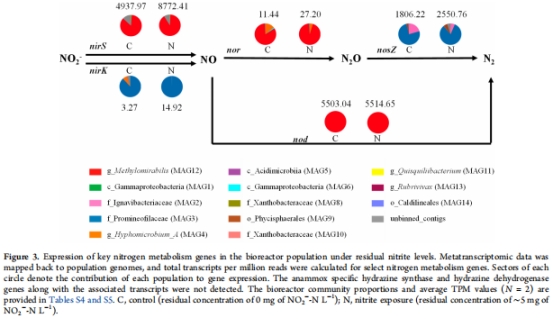 基因證據(jù):宏轉(zhuǎn)錄組分析顯示n-DAMO細(xì)菌的亞硝酸還原酶(nirS)和一氧化氮還原酶(norZ)基因表達(dá)顯著上調(diào)(表1),且無其他菌群顯著表達(dá)nor基因。
