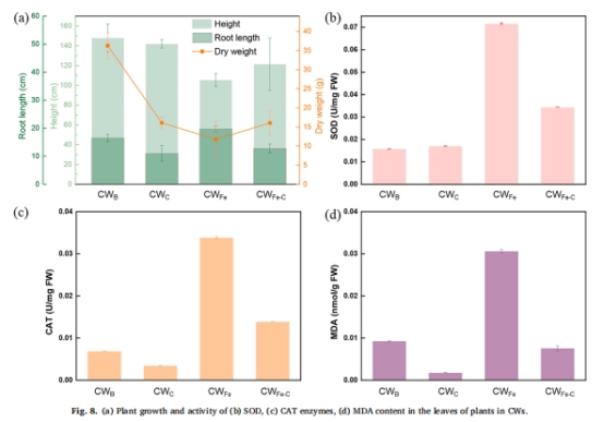 植物毒性降低:生物炭減少60%鐵用量,顯著緩解Fe對鳶尾(Iris wilsonii)的氧化脅迫(SOD活性↓29.5%,圖8b-d)。