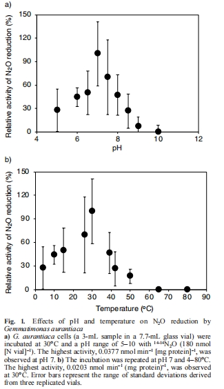 測定 G. aurantiaca的N?O還原活性隨pH(5-10)、溫度(4-80°C)的變化(圖1)。