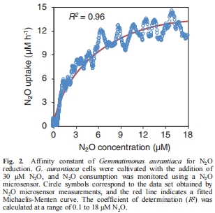 生理特性:G. aurantiaca在pH 5-9、溫度4-50°C范圍內(nèi)均可還原N?O,最適條件為pH 7和30°C(圖1),對N?O的親和常數(shù)(K<sub>s</sub>)為4.4 μM(圖2),表明其在低N?O濃度土壤中高效工作。