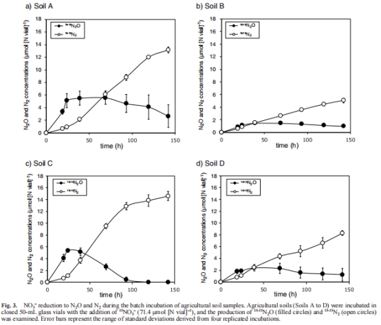 數(shù)據(jù):土壤A-D的N?O還原速率分別為16.6, 5.0, 24.3, 9.5 nmol N g?1 h?1(圖3)。