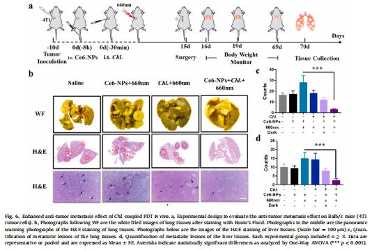 局部腫瘤:Chl.+PDT組完全緩解率62.5%(vs. PDT組27.3%,圖4c);