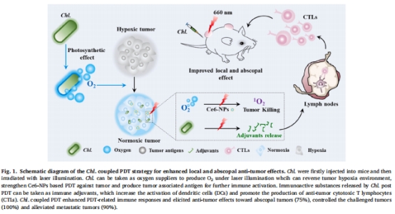 論文提出一種光合微生物(小球藻Chlorella, Chl.)耦合光動力療法(PDT)的新策略,通過雙重機制增強抗腫瘤效果:
