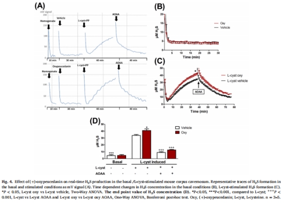 H<sub>2</sub>S實(shí)時(shí)檢測(cè):使用Unisense H<sub>2</sub>S微傳感器測(cè)定(+)-oxypeucedanin對(duì)基礎(chǔ)/刺激條件下H<sub>2</sub>S生成的影響(圖4)。