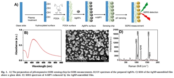 傳感芯片設(shè)計(jì):通過(guò)銀納米粒子(AgNPs)自組裝薄膜修飾4-巰基吡啶(4-MPY)作為pH響應(yīng)探針(圖1A)。