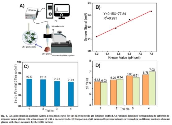 微電極插入組織間隙(圖5C),測(cè)得腫瘤中心pH 6.52 vs. 邊緣7.28,梯度與SERS一致。