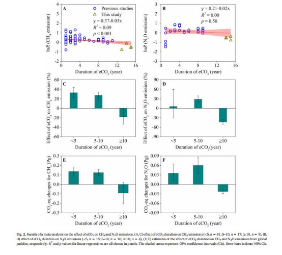 本文通過長期田間實驗(13–15年)和全球薈萃分析,挑戰了“大氣CO?濃度升高(eCO?)必然增加稻田溫室氣體排放”的傳統認知。研究發現: