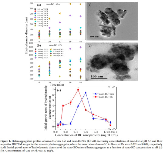 異質(zhì)聚集動力學(圖1a-b,e):nano-BC濃度臨界值(Cc=0.6 mg TOC/L for Goe;0.45 mg TOC/L for Fh)決定異質(zhì)聚集體尺寸(Dh)。低于Cc時靜電吸引形成大聚集體,高于Cc時電荷反轉(zhuǎn)抑制聚集。意義在于闡明nano-BC濃度依賴的聚集行為,為預測環(huán)境遷移提供參數(shù)。