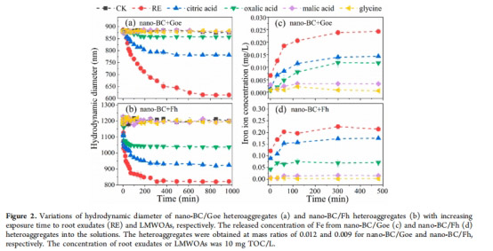 2. 異質(zhì)聚集體形成與解離:通過動態(tài)光散射(DLS)監(jiān)測nano-BC與Fh/Goe的異質(zhì)聚集動力學,分析根分泌物(含66.8%檸檬酸)誘導的解離。