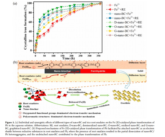 2. 相變機制:nano-BC通過醌/氫醌可逆氧化還原循環(huán)(非多環(huán)芳烴)加速Fh→Goe相變(圖5b)。根分泌物(如檸檬酸)提供電子,經(jīng)nano-BC傳遞至Fh,協(xié)同提升相變速率2倍(k=0.014 h?1)。