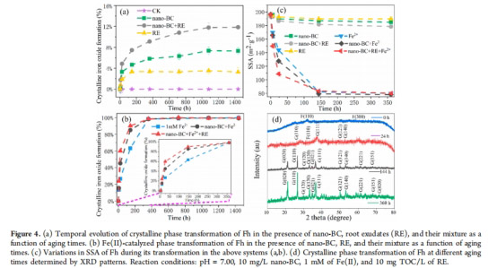 Fh相變速率(圖4a-b):nano-BC/根分泌物混合體系使Fh相變速率常數(shù)(k=0.014 h?1)比對照(無添加,k=0.007 h?1)提高2倍。意義在于驗證nano-BC與根分泌物的協(xié)同效應(yīng),打破“NOM保護Fh”的傳統(tǒng)認知。