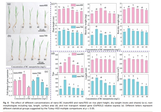 植物生理響應(yīng)(圖6):過量nano-BC(20 mg L?1)使根干重降低30%、OsFRDL1(鐵轉(zhuǎn)運基因)表達下調(diào)2.5倍(p < 0.05)。意義在于警示過量nano-BC的生態(tài)風(fēng)險,需嚴格管控施用量。