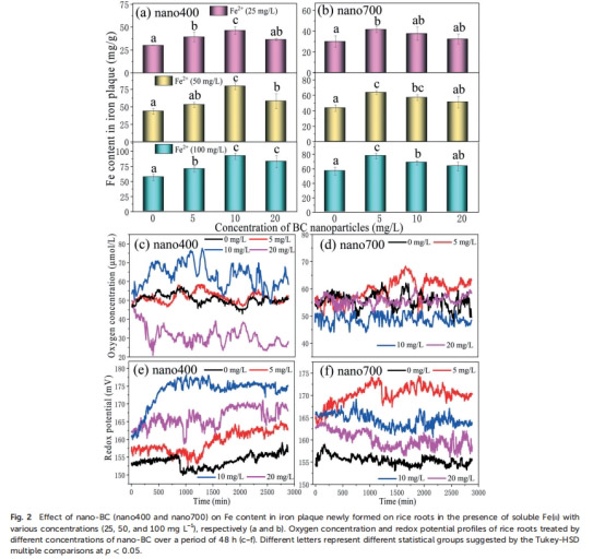 抑制效應(yīng)解析:過量nano-BC(20 mg L?1)導(dǎo)致Eh和O?濃度下降(圖2c-f),結(jié)合SEM觀測(根表堵塞),證實過量附著阻礙氧氣分泌與擴散。此發(fā)現(xiàn)解釋鐵斑抑制的生理基礎(chǔ),指導(dǎo)安全濃度閾值設(shè)定(nano400 ≤ 10 mg L?1, nano700 ≤ 5 mg L?1)。