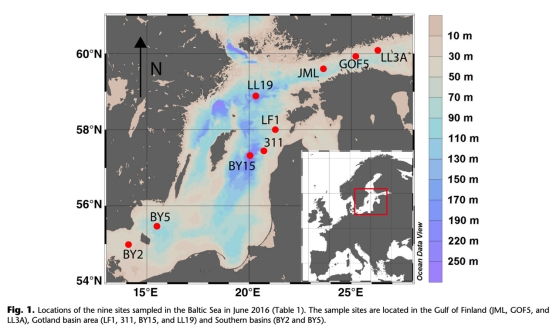 1. 選取波羅的海9個代表性站位(圖1),覆蓋梯度氧狀態(tài)(季節(jié)性缺氧→永久硫化)