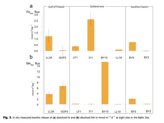 ? 數(shù)據(jù):季節(jié)性缺氧區(qū)釋放最高(Fe: 2.6 mmol/m2/d, Mn: 15.3 mmol/m2/d)