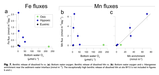 ? 數(shù)據(jù):表層沉積物易還原Fe氧化物富集(Feox1),Mn富集與底棲Mn釋放正相關(guān)(圖7c)