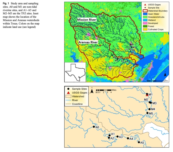 1. 梯度設計:在Mission和Aransas河流的潮汐淡水區(TFZ)和非潮汐站點(各5-6個站點)進行采樣,覆蓋上游至下游梯度(圖1)。