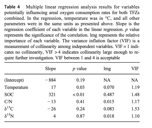 3. 環境參數:水溫(夏季25.5±0.3°C,冬季19.3±2.3°C)。數據來自方法部分和表4(回歸分析)。研究意義:溫度影響微生物活性,與SOC共同驅動O2消耗;解釋季節性差異較?。ㄒ蚨緶睾停?。
