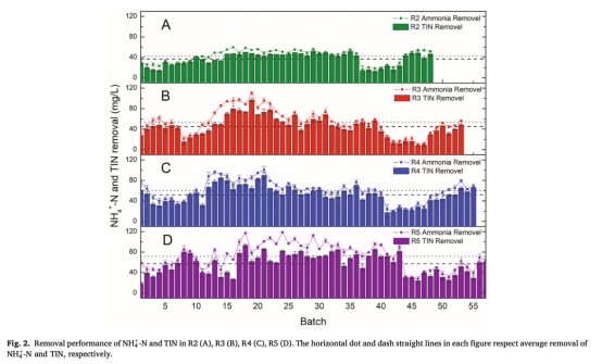 ? NH??-N去除量:R2(42.28 mg/L) < R5(71.91 mg/L)