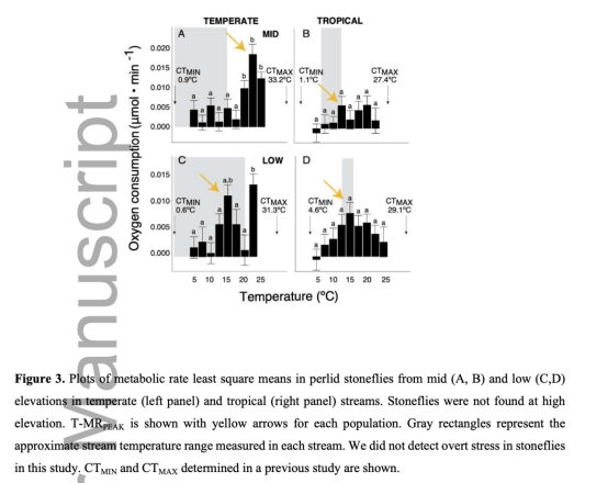 ? 數據:熱帶蜉蝣代謝率隨溫度上升更快(圖4A-C),高溫下出現明顯應激(圖2紅條);溫帶蜉蝣代謝響應平緩(圖2藍線)。石蠅無緯度差異(圖3,5)。