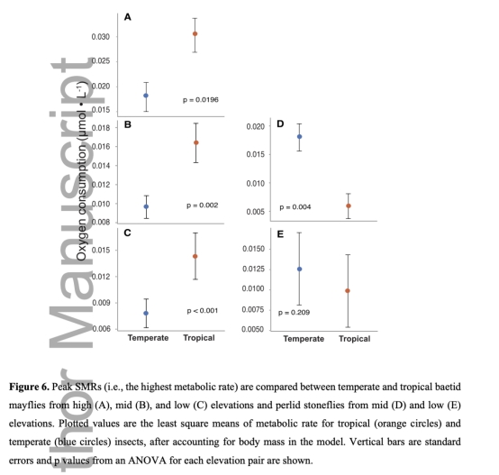 ? 數據:熱帶蜉蝣峰值代謝率顯著高于溫帶(圖6A-C);熱帶石蠅峰值低于溫帶(圖6D-E)。