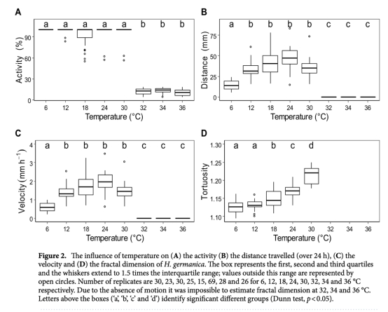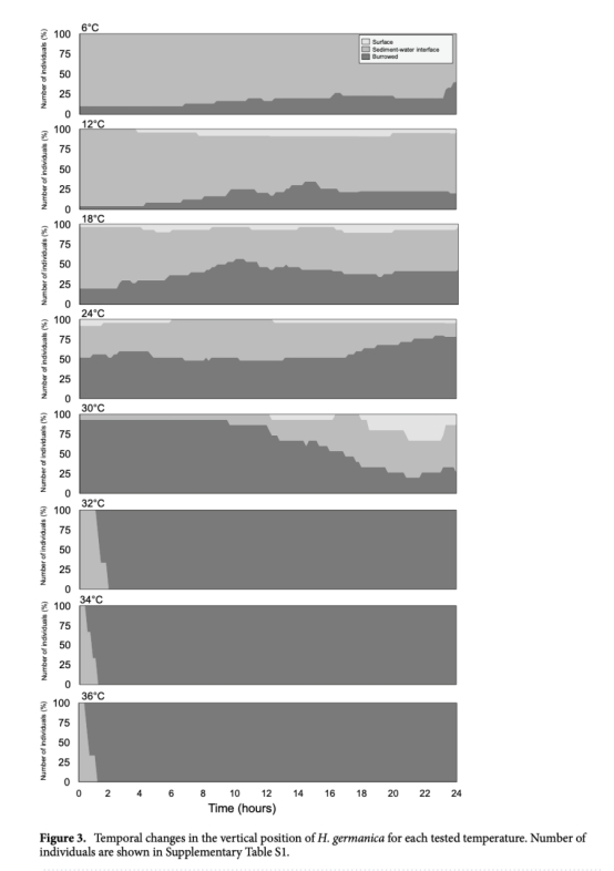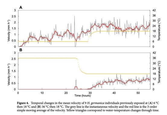 1. 行為響應:在常規溫度(6-30°C)下,H. germanica保持高活動性(>90%時間移動),速度峰值在24°C(1.74 mm/h);極端高溫(>32°C)導致活動驟降(<15%),個體迅速鉆入沉積物并停止運動,軌跡復雜度(分形維度)顯著增加至30°C但無法測量于32-36°C。