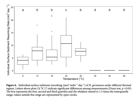 3. 生態系統功能影響:沉積物再加工率在24°C最高(10.1 mm3/個體/天),但在>32°C降至零;氧氣預算在熱浪下轉為負值,表明物種對沉積物混合和碳循環的貢獻被削弱。