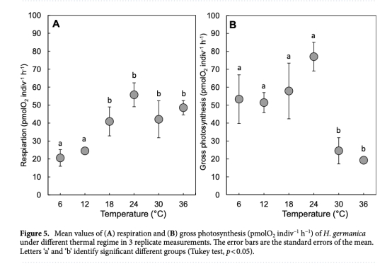 3. 代謝率數據:包括氧消耗(呼吸速率)和光合作用(凈光合和總光合速率),使用Unisense微電極測量。這些數據來自Figure 5。研究意義是量化溫度對能量代謝的影響,揭示光合效率下降如何導致氧氣預算負值,解釋熱浪下物種生理壓力,并鏈接至生態系統尺度的氧氣通量和碳循環擾動。