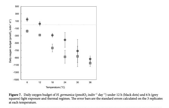 5. 氧氣預算數據:計算每日氧氣平衡(基于光合和呼吸速率),考慮光照暴露時間(6小時和12小時)。這些數據來自Figure 7。研究意義是量化有孔蟲在生態系統中的凈氧氣貢獻,顯示熱浪下氧氣生產轉為負值,凸顯其對底棲缺氧環境的潛在惡化作用。