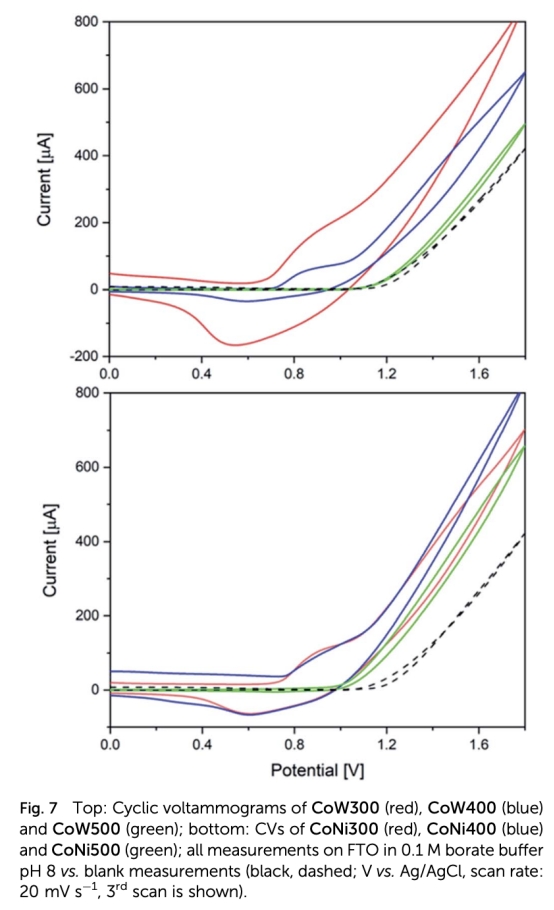 研究開發(fā)了開放式鈷多金屬氧酸鹽(POM)[(A-α-SiW?O??)Co?(OH)?(CH?COO)?]??(Co(1))及其鈷鎳混合類似物[(A-α-SiW?O??)Co?.?Ni?.?(OH)?(CH?COO)?]??(CoNi(2)),探究其光催化與電催化水氧化性能。Co(1)表現(xiàn)出優(yōu)異的光催化產氧活性(63% O?產率),優(yōu)于多數(shù)POM催化劑。二者作為前驅體經煅燒(200–500°C)生成非晶/晶態(tài)CoWO?和Co?.?Ni?.?WO?納米顆粒。300°C煅燒所得非晶CoW300電催化性能顯著提升(起始電位0.79 V vs. Ag/AgCl),優(yōu)于傳統(tǒng)共沉淀法制備的CoWO?(0.84 V)。鎳摻雜未產生協(xié)同增效作用,突顯催化劑性能對合成路徑的依賴性。