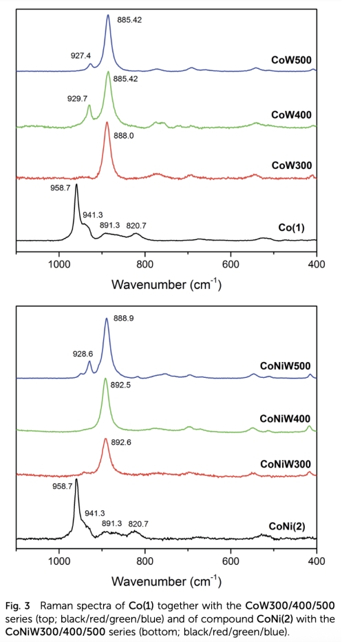 ? 數(shù)據(jù):300°C煅燒得非晶相(CoW300),400°C以上生成晶態(tài)CoWO?;Raman光譜885 cm?1處W-O振動峰藍移表明Co-Co距離縮短