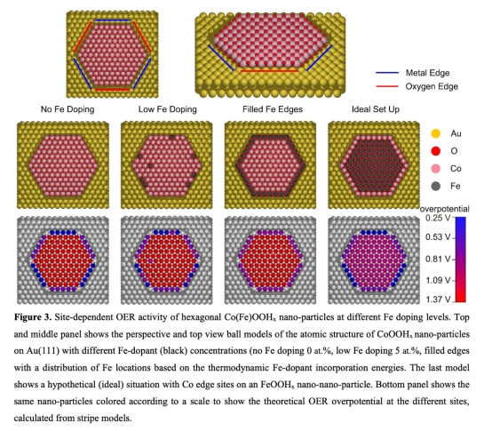 ? 采用DFT計算Fe在不同位置(邊緣/基面)的摻雜能(圖2)及OER過電位(圖3)。結果顯示Fe優先占據邊緣位點,但Fe摻雜邊緣位點的OER過電位(0.69V)高于純Co邊緣位點(0.30V)。