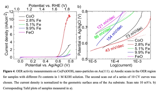 ? 通過循環伏安法(CV)測量OER活性(圖4a),發現2.8 at.% Fe樣品活性最高(6.5 mA/cm2),而高Fe濃度(9.9 at.%)樣品活性接近純FeOOHx。塔菲爾斜率分析(圖4b)表明低Fe樣品(73 mV/dec)與純CoO(43 mV/dec)反應機制相似。
