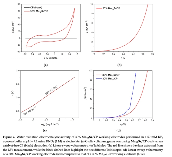 ? 測量內(nèi)容:Mn18Sr起始過電位192 mV,1 mA cm?2/10 mA cm?2過電位為284 mV/550 mV;塔菲爾斜率220/260 mV dec?1(圖2c)。