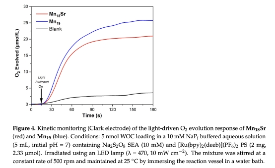 ? 驗證催化本質(zhì):Mn18Sr的O?產(chǎn)量與電荷量匹配(TON=21.6),證實水氧化路徑主導(dǎo),排除配體氧化等副反應(yīng)。