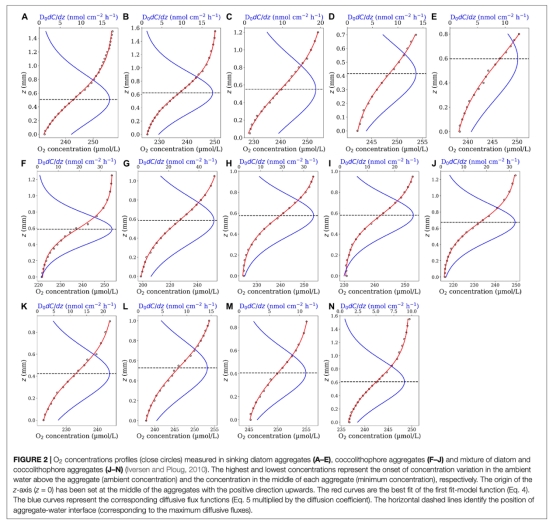 ? 使用Unisense微電極實(shí)測(cè)的O?剖面數(shù)據(jù)(圖1A-E:藍(lán)藻/硅藻聚集體;圖2:14種下沉聚集體;圖5:海底沉積物)。
