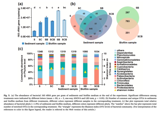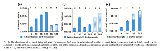 ? 意義:解釋氮去除增強的微生物驅(qū)動機制(SCB組沉積物+生物膜的nirS+hzsB基因總量顯著高于其他組)。