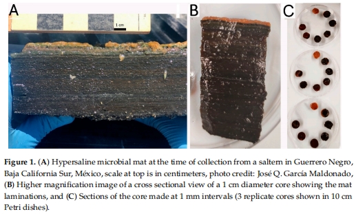 采集瓜納羅內(nèi)格羅鹽場(chǎng)高鹽微生物墊(鹽度125 ppt),按 1 mm間隔 分層(0–7 mm)(圖1C)。