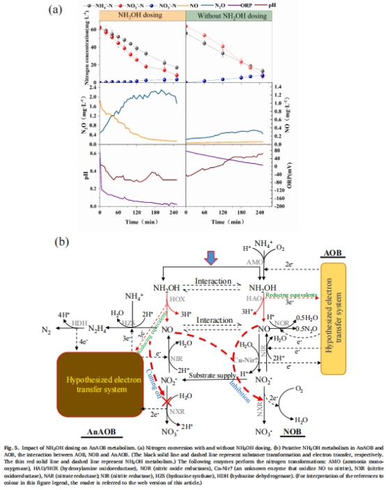 羥胺被AOB/AnAOB氧化生成NO,通過毒性抑制NOB(圖5b)。