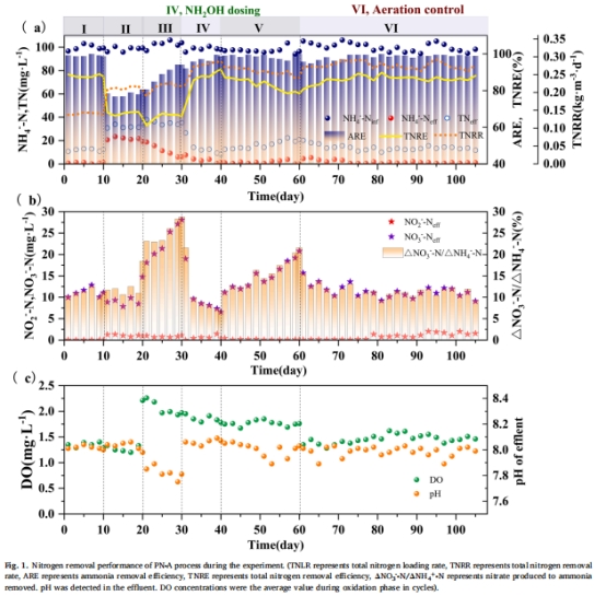 階段V(停加驗(yàn)證):停用羥胺→NOB恢復(fù)(TNRE↓至78.4%)。