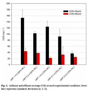結果:平均去除率COD 63.1%±19.3%、TSS 82.4%±18.7%,出水COD<44 mg/L,TSS<58 mg/L。