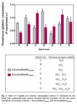 NO??為電子受體時,Accumulibacter磷攝取/電子消耗比最高(0.11 mmol P/mmol e?)。