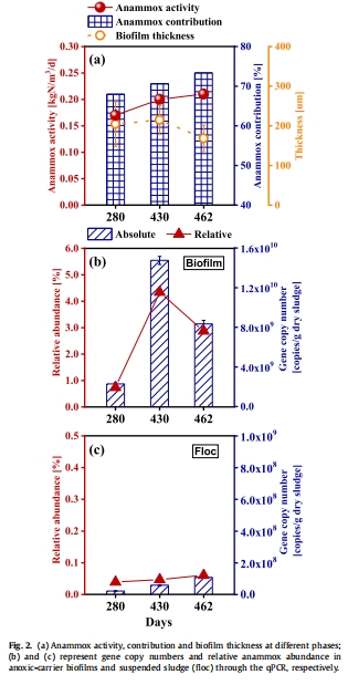 數(shù)據(jù):缺氧生物膜中anammox豐度達4.34%(qPCR),貢獻68%-73.4%的脫氮(批次測試)。